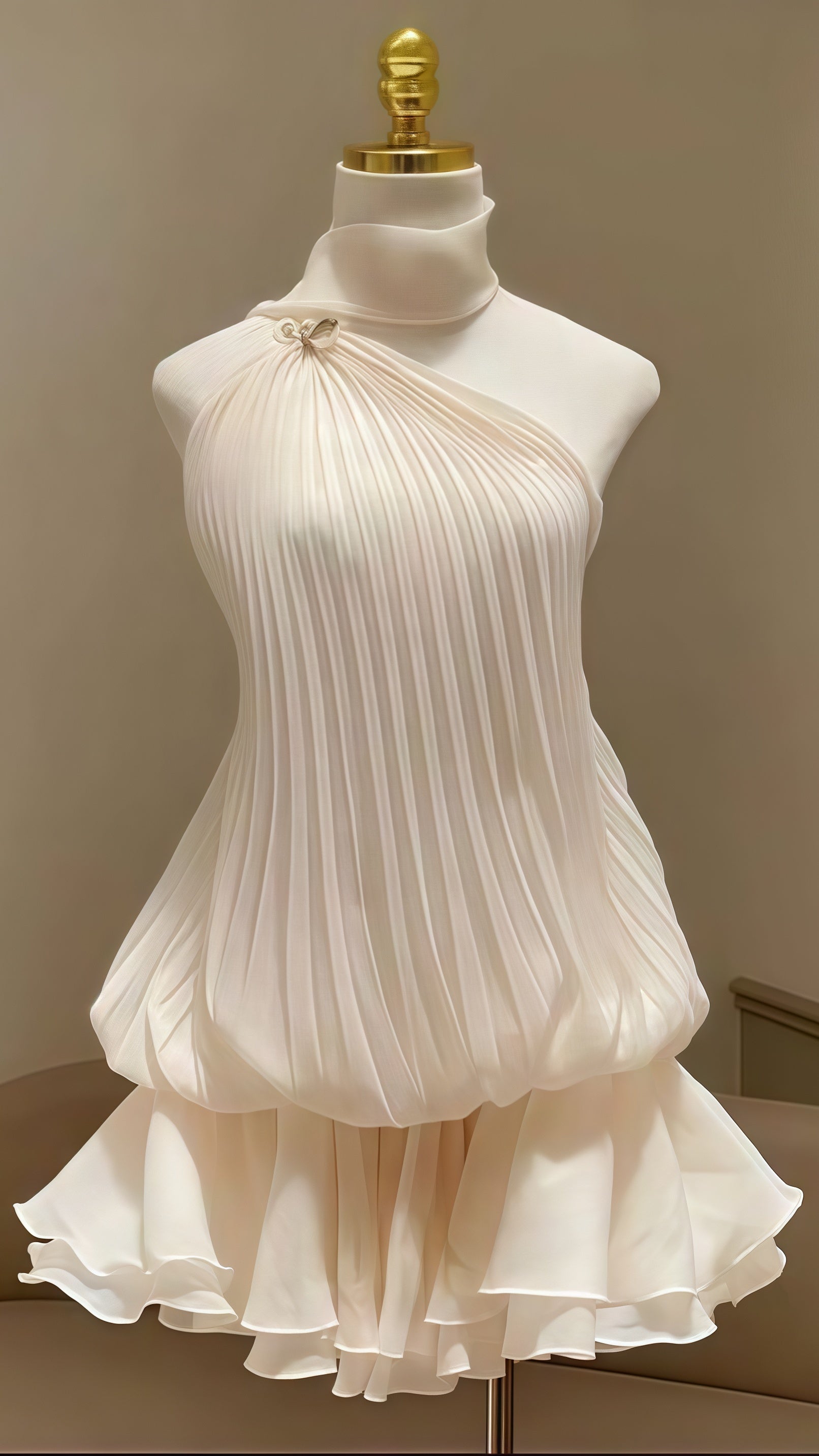 Dress DetailStyle: A-lineFabric: ChiffonColor: IvoryLength: MiniNeckline: HalterSleeves: Sleeveless