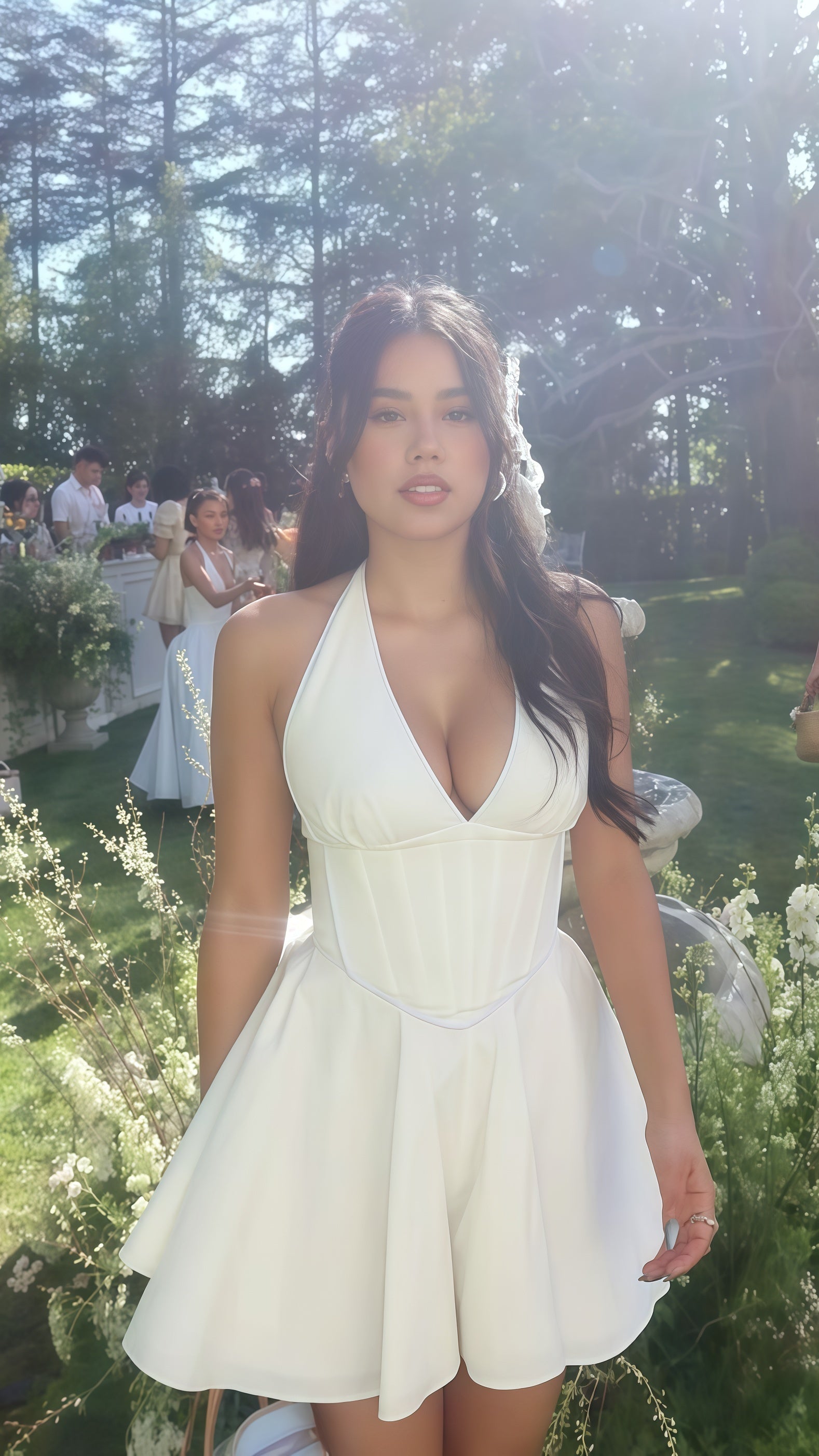 Dress DetailStyle: A-lineFabric: SatinColor: IvoryLength: MiniNeckline: V-neckSleeves: Halter