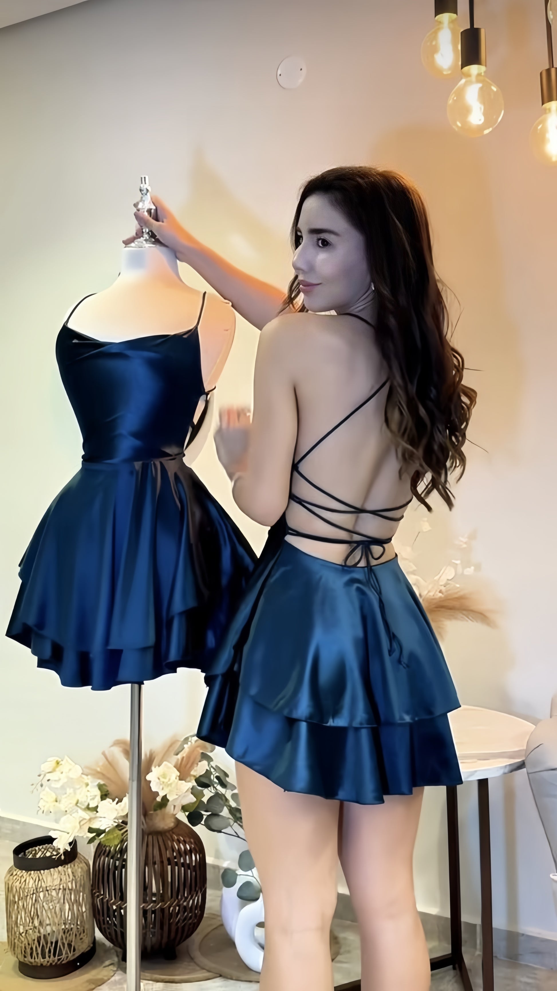 Dress DetailStyle: A-lineFabric: Satin Color: Navy BlueNeckline: V-neckSleeves: Sleeveless