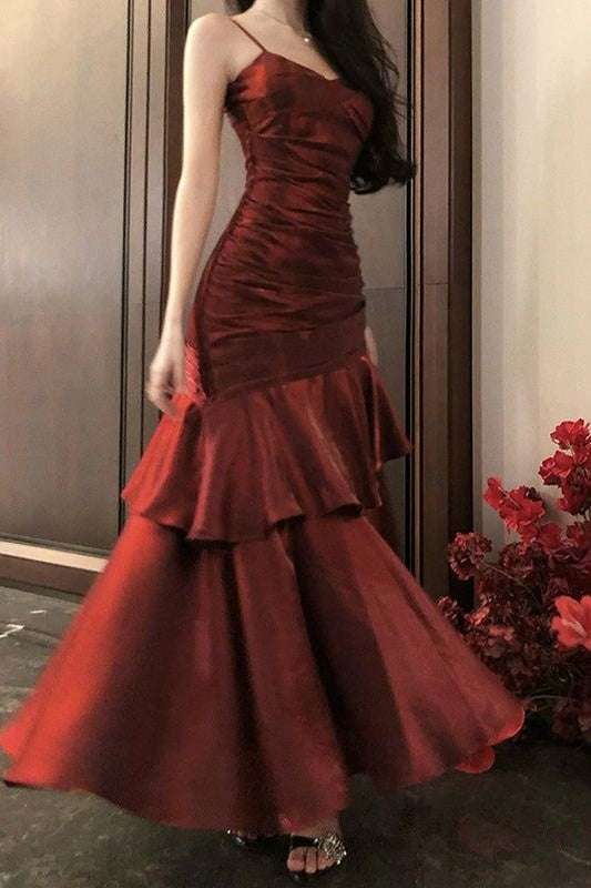 Spaghetti Straps Burgundy Long Prom Dresses Ruffles Maxi Prom Dress, Formal Dress,AST2103